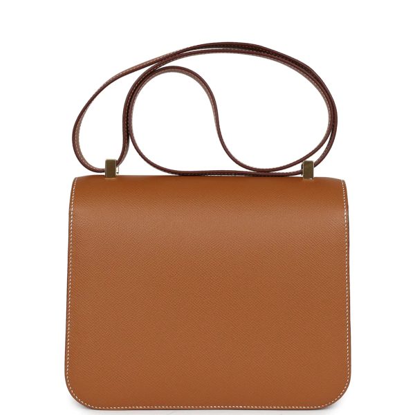 This Constance is in gold epsom leather with gold hardware and has contrast stitching, a metal “H” snap lock closure, and adjustable shoulder strap.