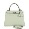 This Sellier Kelly is of Vert Olive epsom leather with gold hardware and has tonal stitching, front flap, two straps with center toggle closure, clochette with lock and two keys, single rolled handle and an optional shoulder strap.