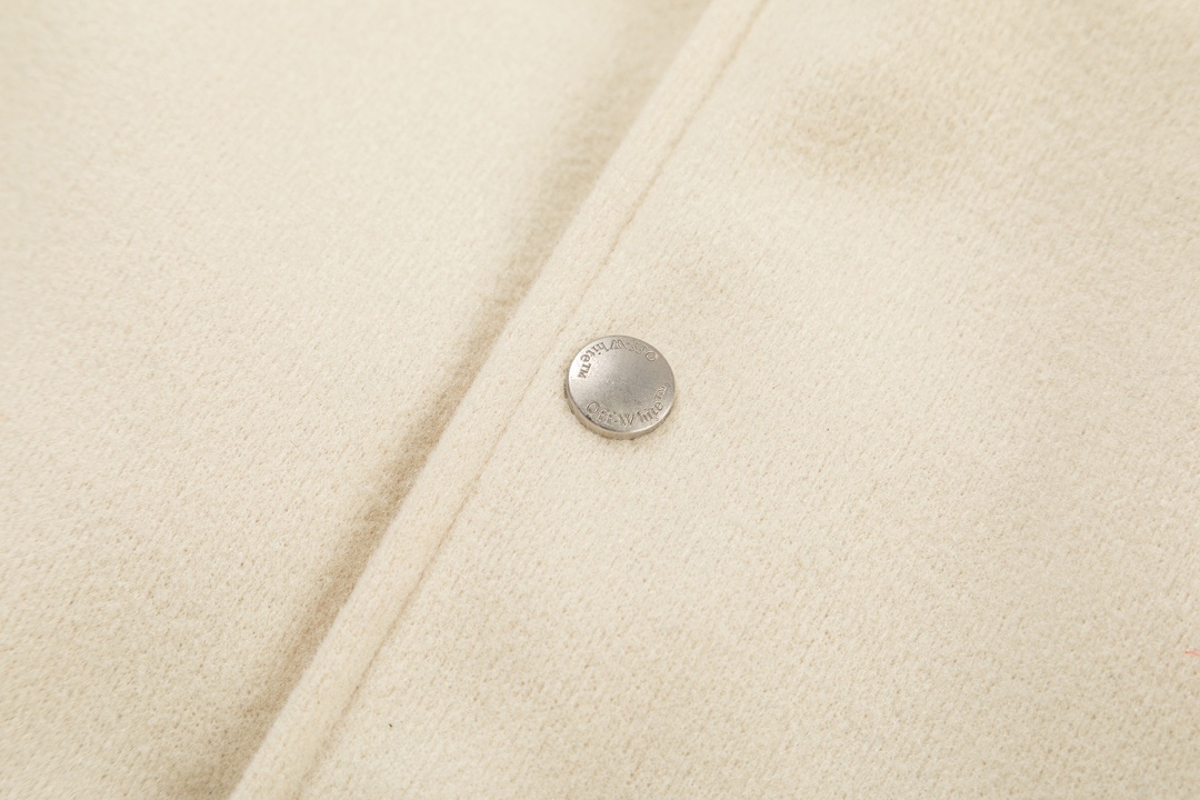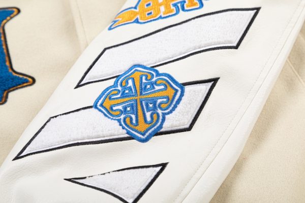 Off-White 2024 Fall/Winter new heavy embroidery patchwork leather varsity jacket in beige, unisex
